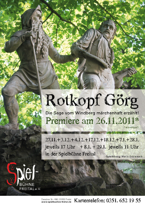 Zu Weihnachten 2011 und zum 90ten Geburtstag der Stadt Freital inszenierte die Spielbühne Otto Roths Version der Freitaler Sage in neuem Gewand, temporeich und komisch aber ohne die Kernaussage zu vergessen. Ganz im Gegenteil: Die Geschichte wird geradlinig erzählt, zeitgemäß aufgelockert und kommt ohne angestaubten Singsang daher. Im Gegensatz zu der Inszenierung von 1993 verzichtete Regisseur Mario Grünewalds Fassung auf allzu große Werktreue und erhobenen Zeigefinger zu Gunsten einer unterhaltsamen Erzählung der Kerngeschichte. Mit: Charlotte Frenzel, Lilian Gruler, Anke Hasselbusch, Carolin Hasselbusch, Kerstin Hofmann, Anne Konstanze Lahr, Kathrin Lauer, Tina Lohse, Linda Nicolai, Julia Ressel, Tilmann Gaitzsch, Patrice Kind, Witja Kümpel, Karl-Michael Weber